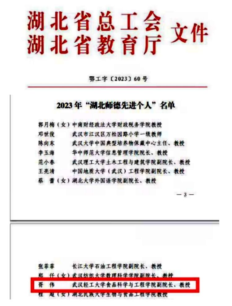 本网讯 日前,湖北省总工会、湖北省教育厅联合印发《关于2023 年“湖北十佳师德标兵” “湖北师德先进个人”选树结果的通报》。我校食品科学与工程学院胥伟教授榜上有名,喜获2023年“湖北师德先进个人”荣誉称号。