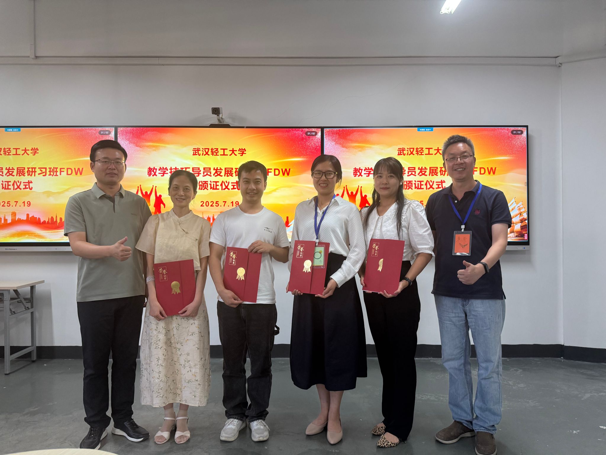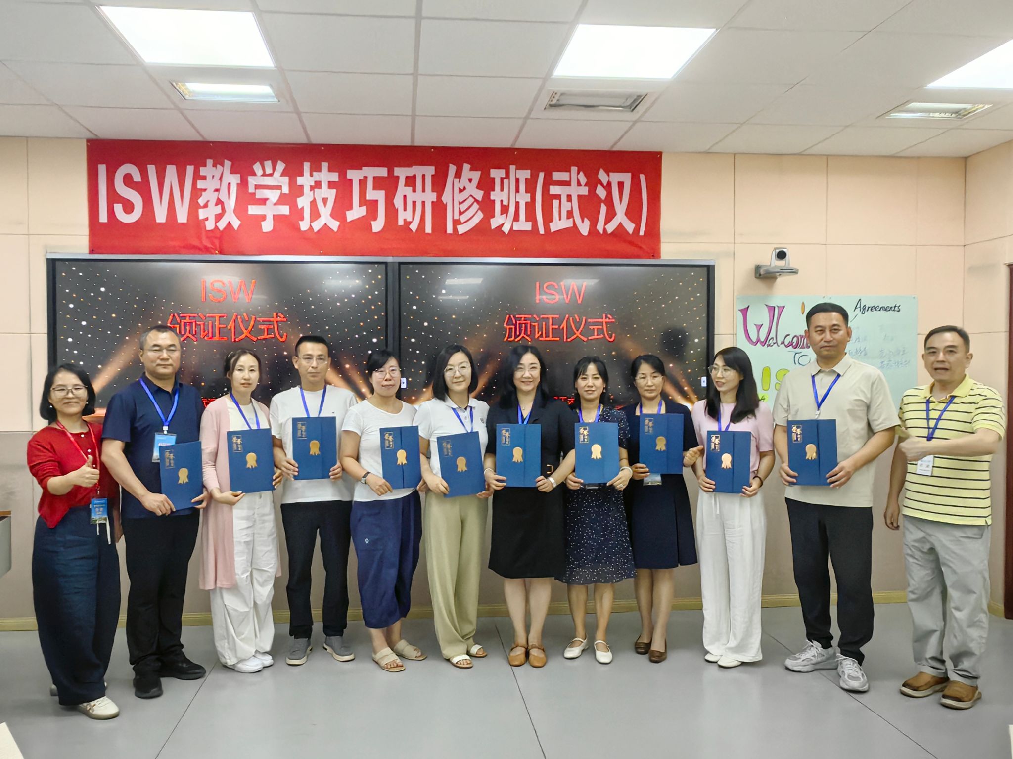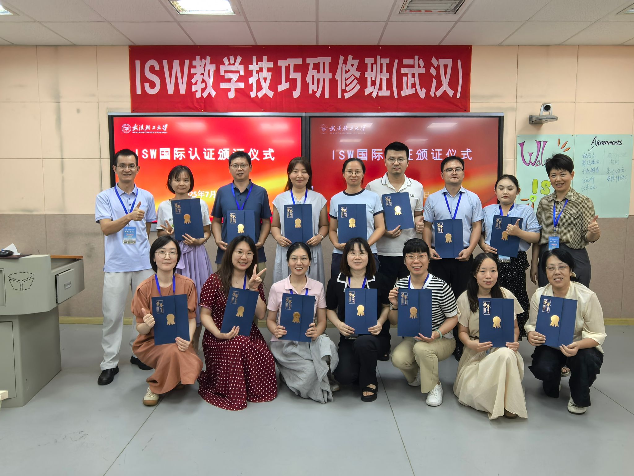 最后,经过四天封闭式培训演练,FDW培训师和ISW引导员审慎评估、学校教师发展中心全过程督导,28位参训教师全部高质量完成了所有的培训环节,分别获得了ISW、FDW国际认证证书。教师发展中心副主任罗伟与培训师一起为学员颁发了国际认证证书,希望参训学员能学有所获并将所学技能带到所在学校,为课堂教学创新和人才培养质量提升做出积极贡献。
